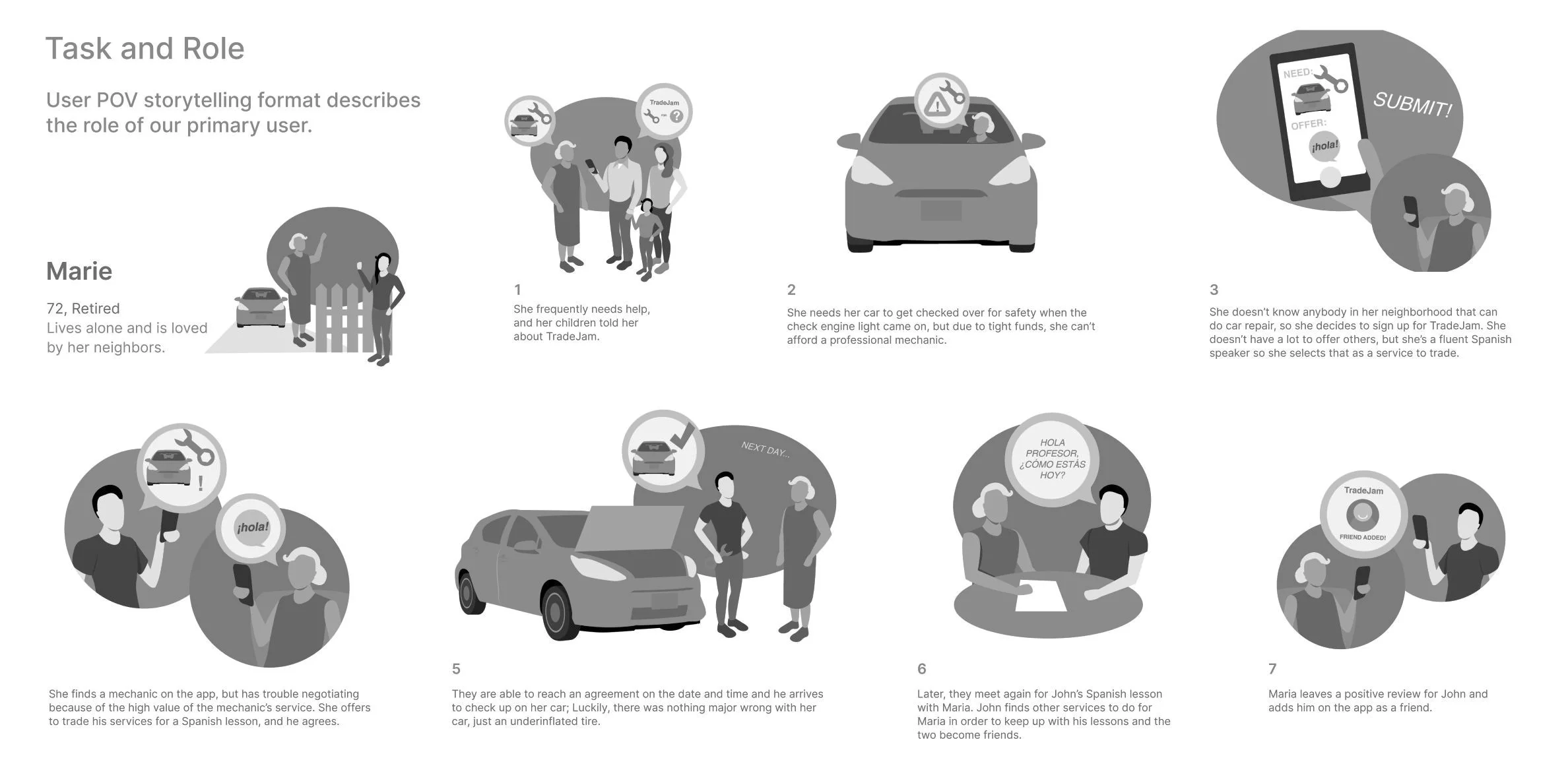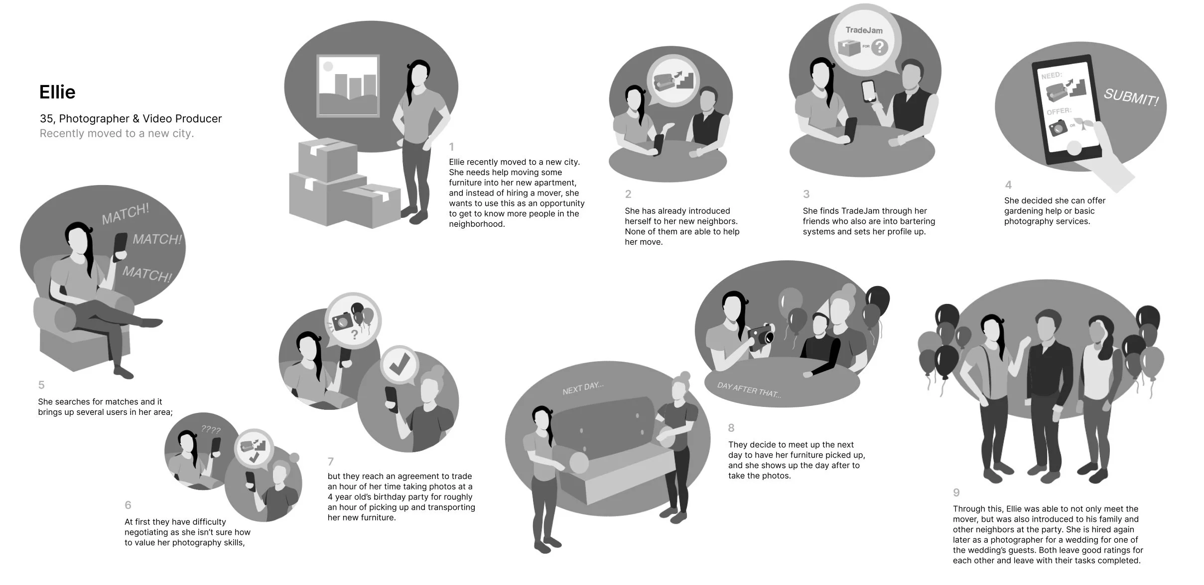 Storyboards illustrate a situation where each Proto-Persona uses the platform (originally referred to as TradeJam) to meet needs that mirror those found in the data.