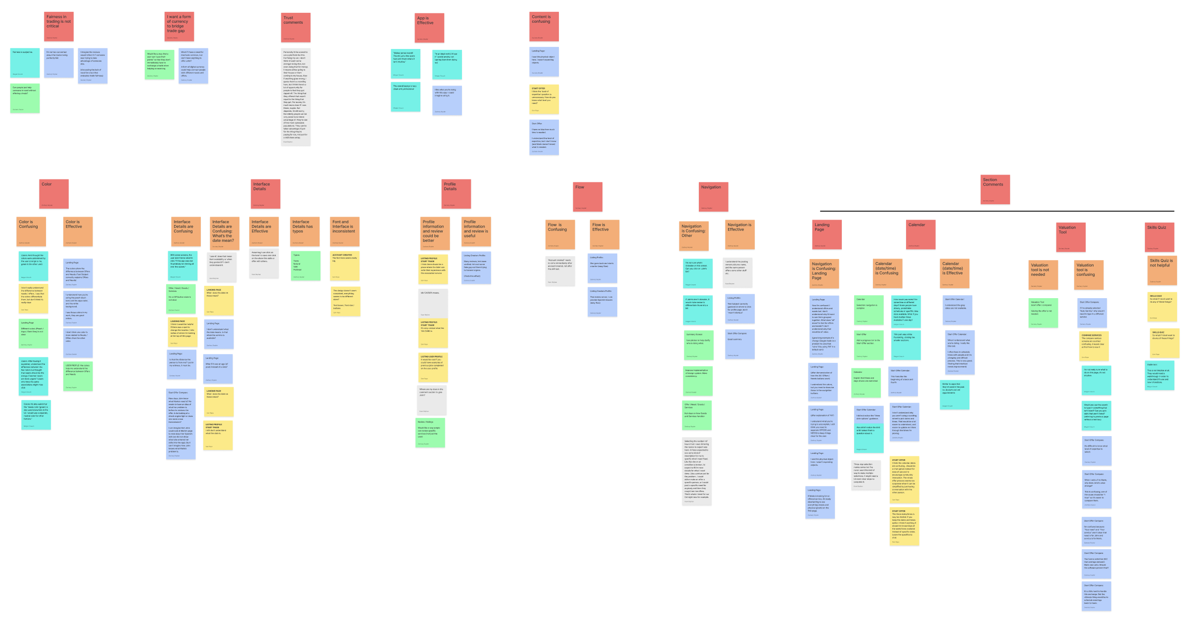 The Affinity Map revealed significant themes: positive attitudes towards community, a need for trust, and a need for fair value. Other insights describe technology as a crucial tool providing information and convenience. We discover people are rewarded by completing tasks. Areas of concern are available time, communication, scheduling, and finding value to offer others.